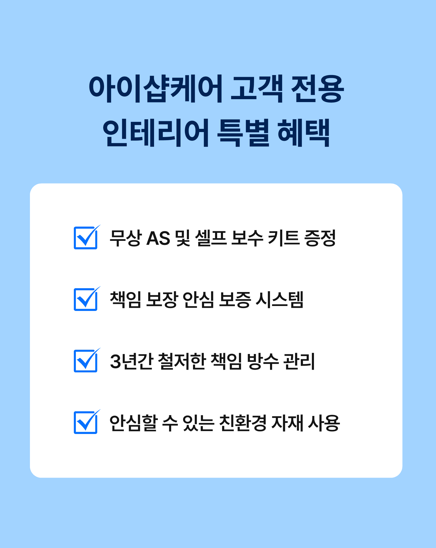 • 제공되는 혜택으너 시공 면적(평수), 자재 등급, 결합 조건에 따라 상이할 수 있습니다.