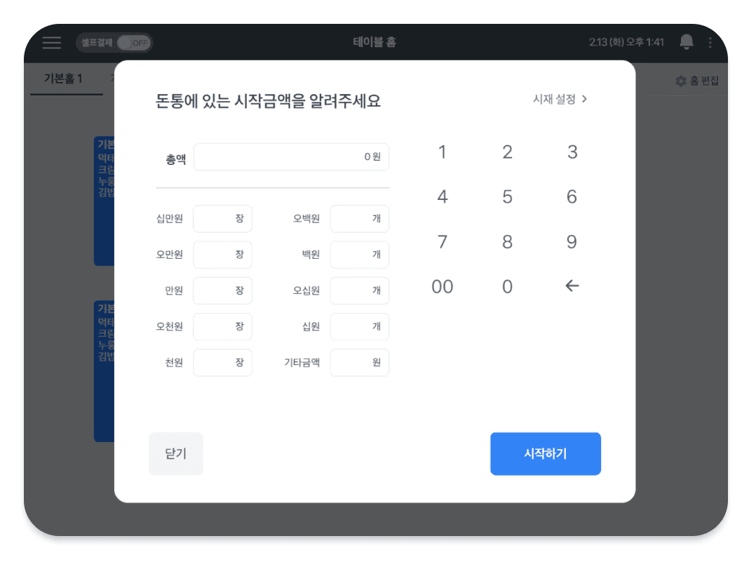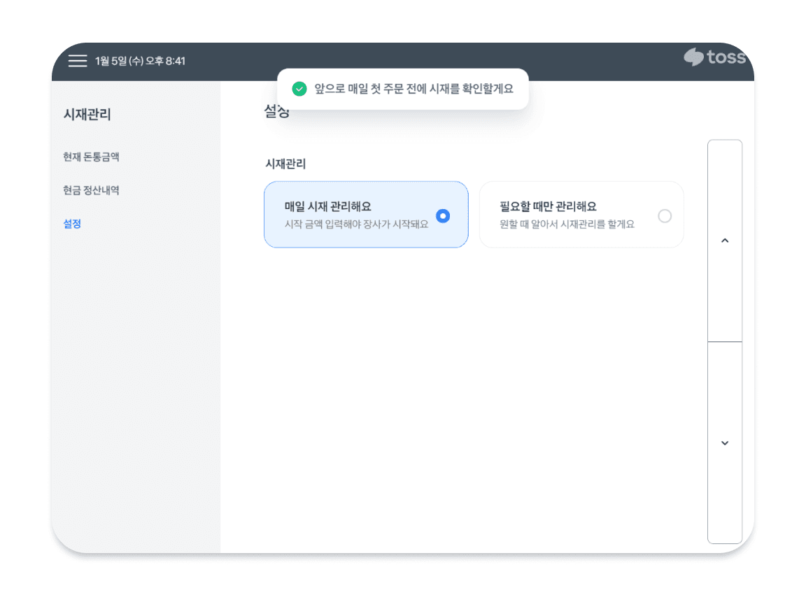 [시재관리] → [설정] → 원하는 시재 관리 방식 선택하고