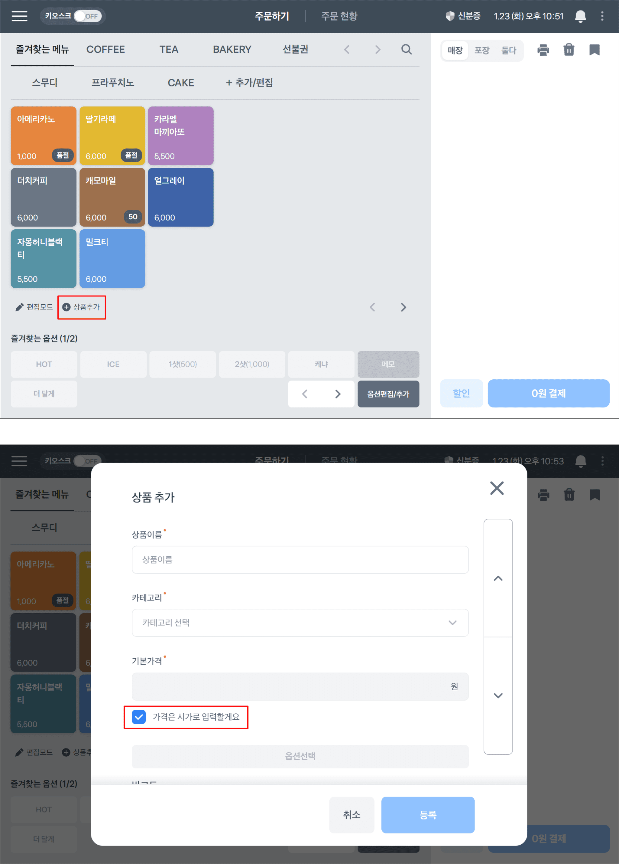 포스 메인화면 하단 [+상품추가]를 누르고 메뉴를 먼저 등록한 후 가격은 "시가로 입력할게요"를 체크해주세요