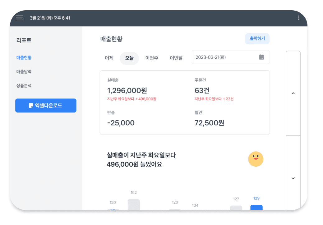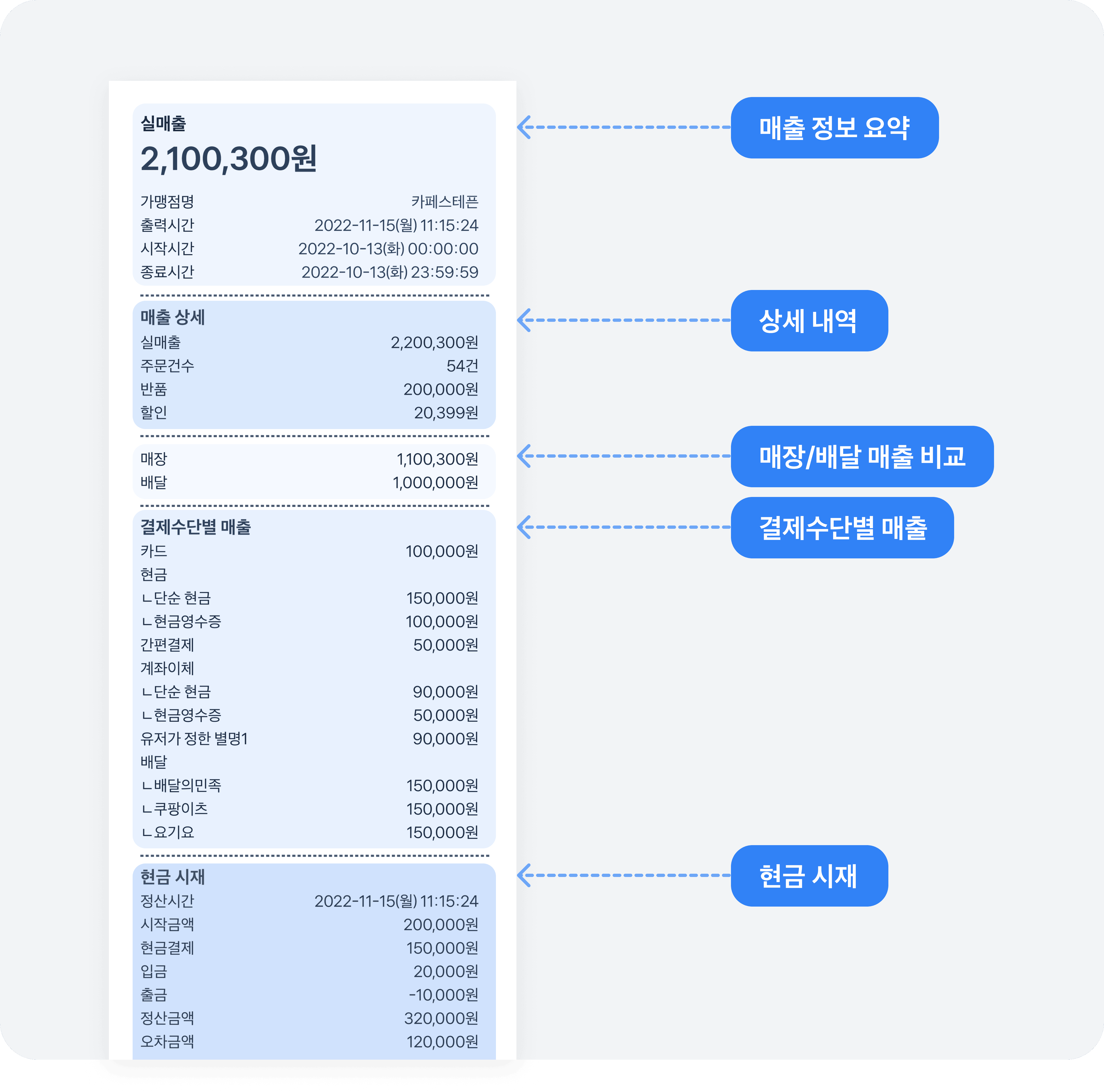 시재 정리 완료 후 [시재관리] → [현금 정산내역] → [총매출 보기]에서 정산 내역을 확인할 수 있어요