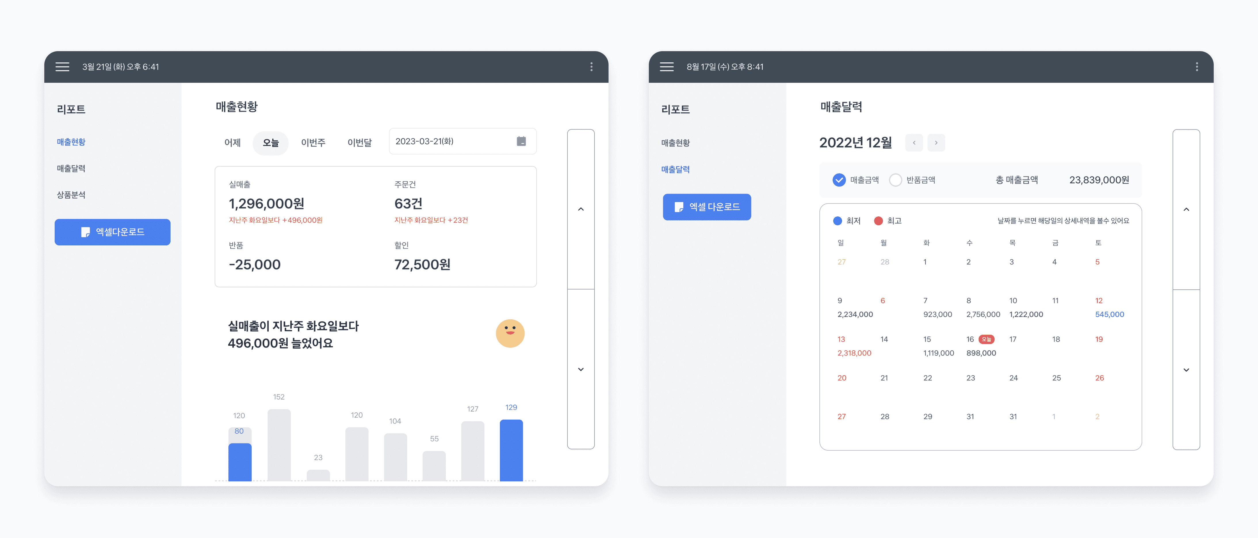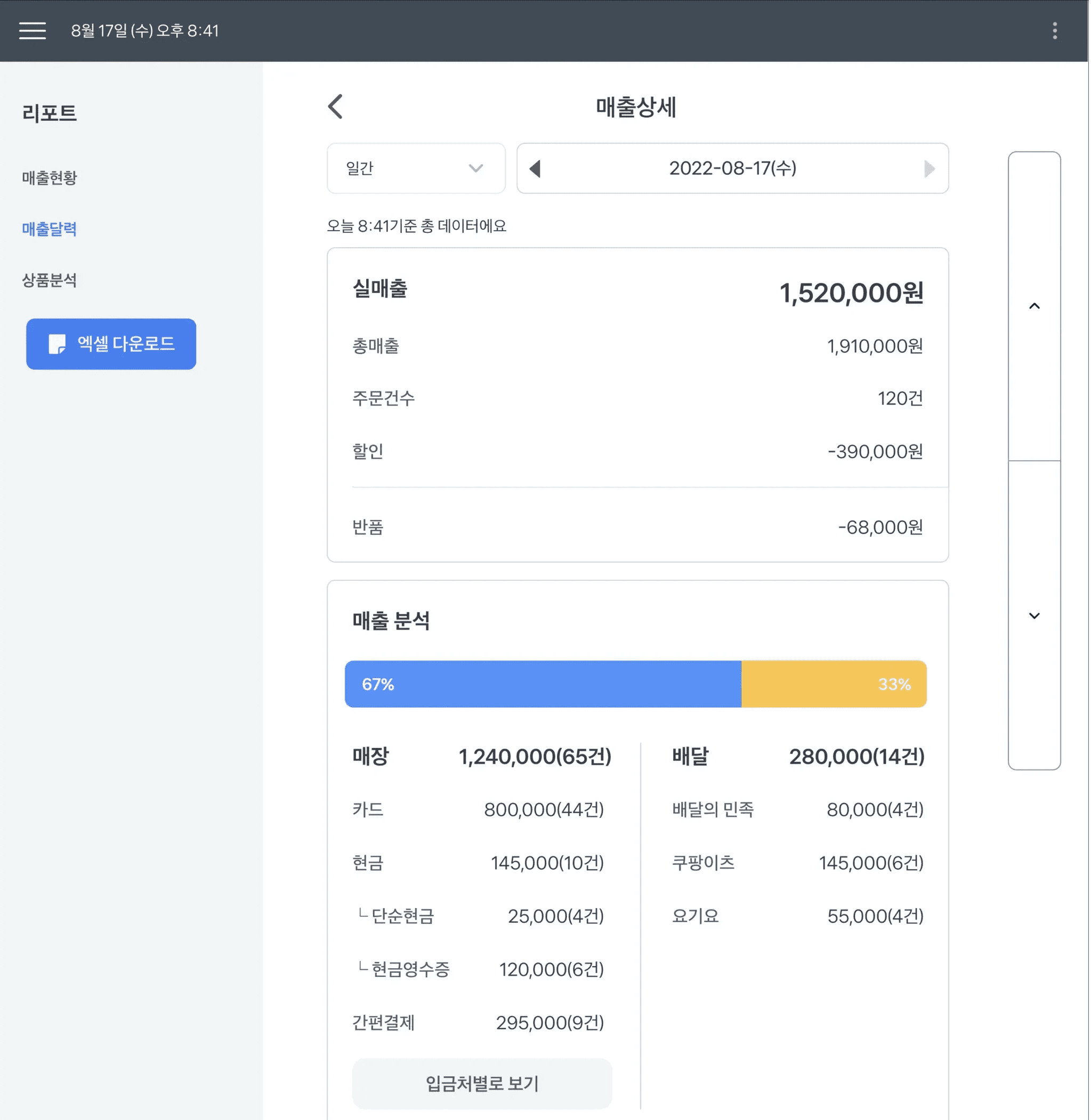 매출리포트에서 실시간으로 배달 매출과 매장 매출 모두 확인할 수 있어요