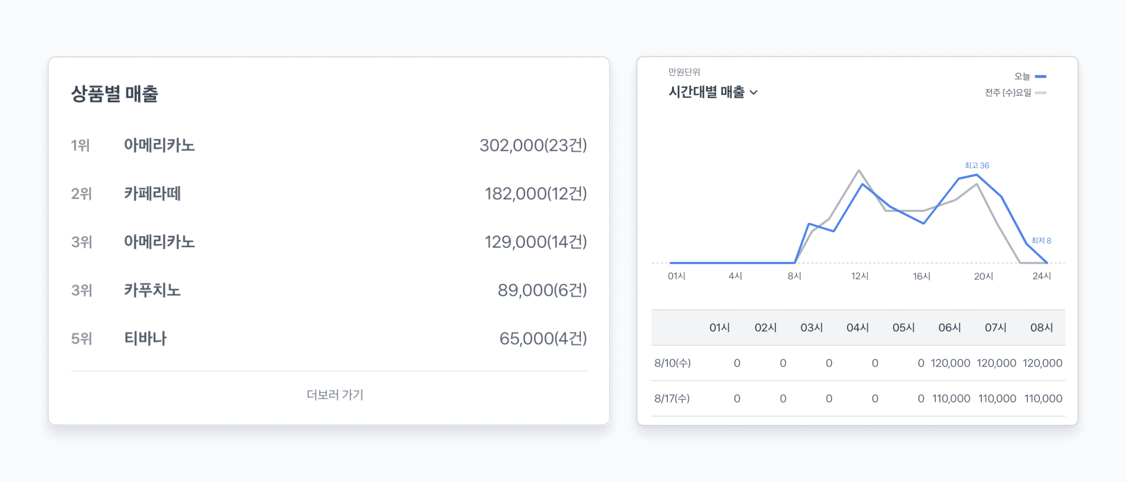 상품분석과 시간대별 매출도 매장과 배달이 통합돼요.