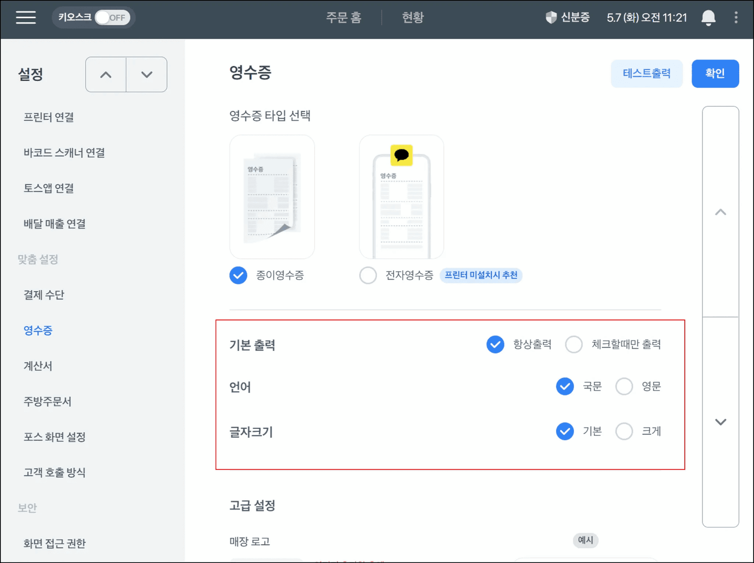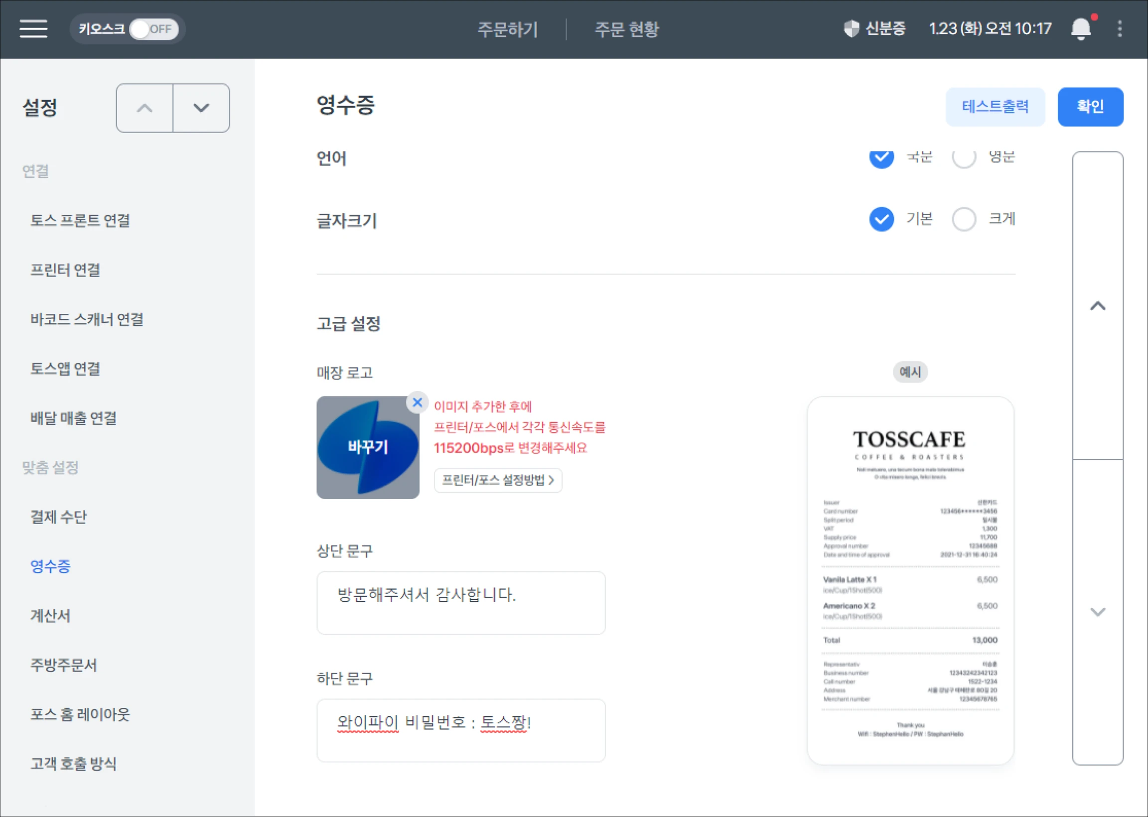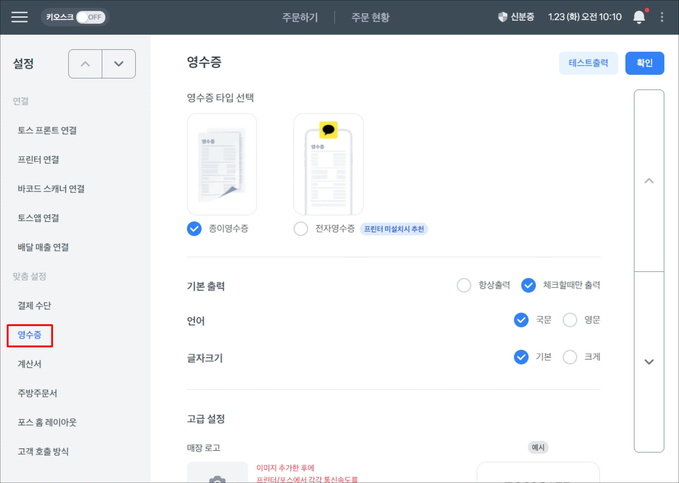 포스 왼쪽 상단 [≡] > [설정]에서 영수증 커스텀을 위한 고급 설정을 진행해주세요.