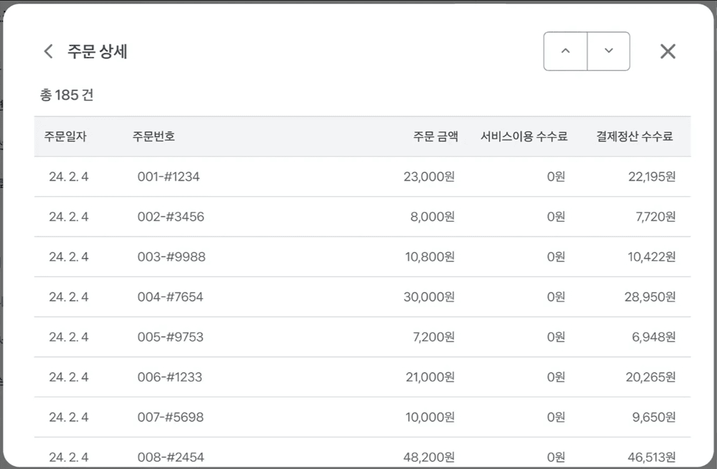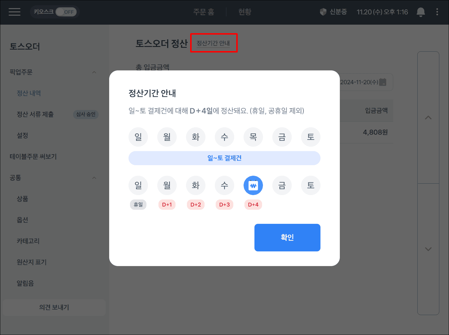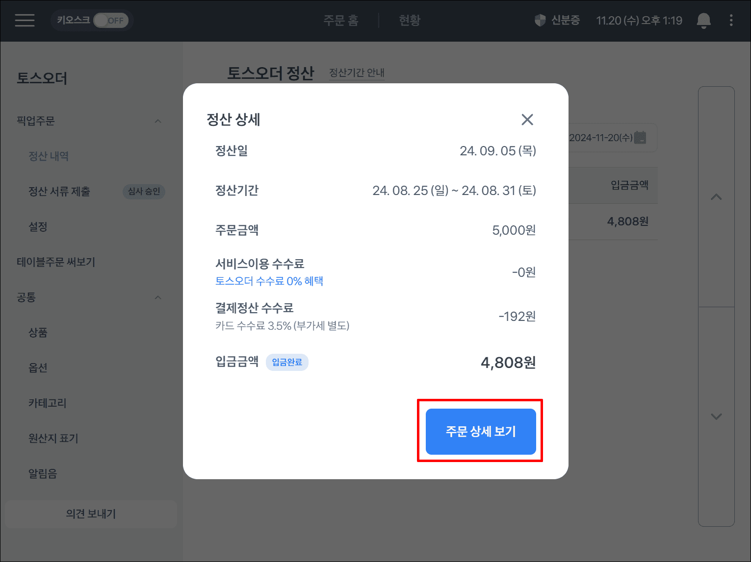 포스 왼쪽 상단 [≡] > [키오스크·토스오더] > [토스오더 관리] > [정산 내역]에서상세 내역을 확인 할 수 있어요.