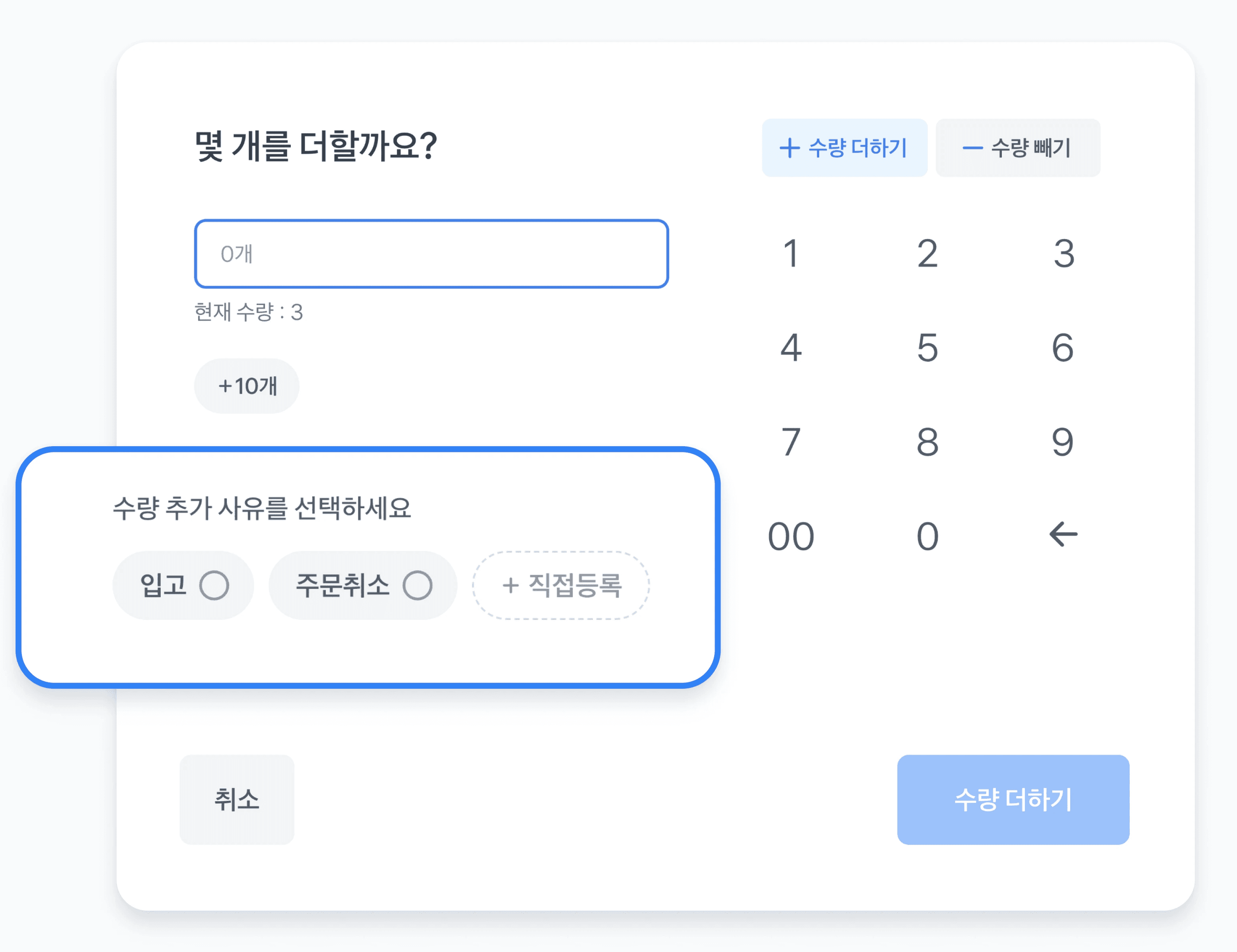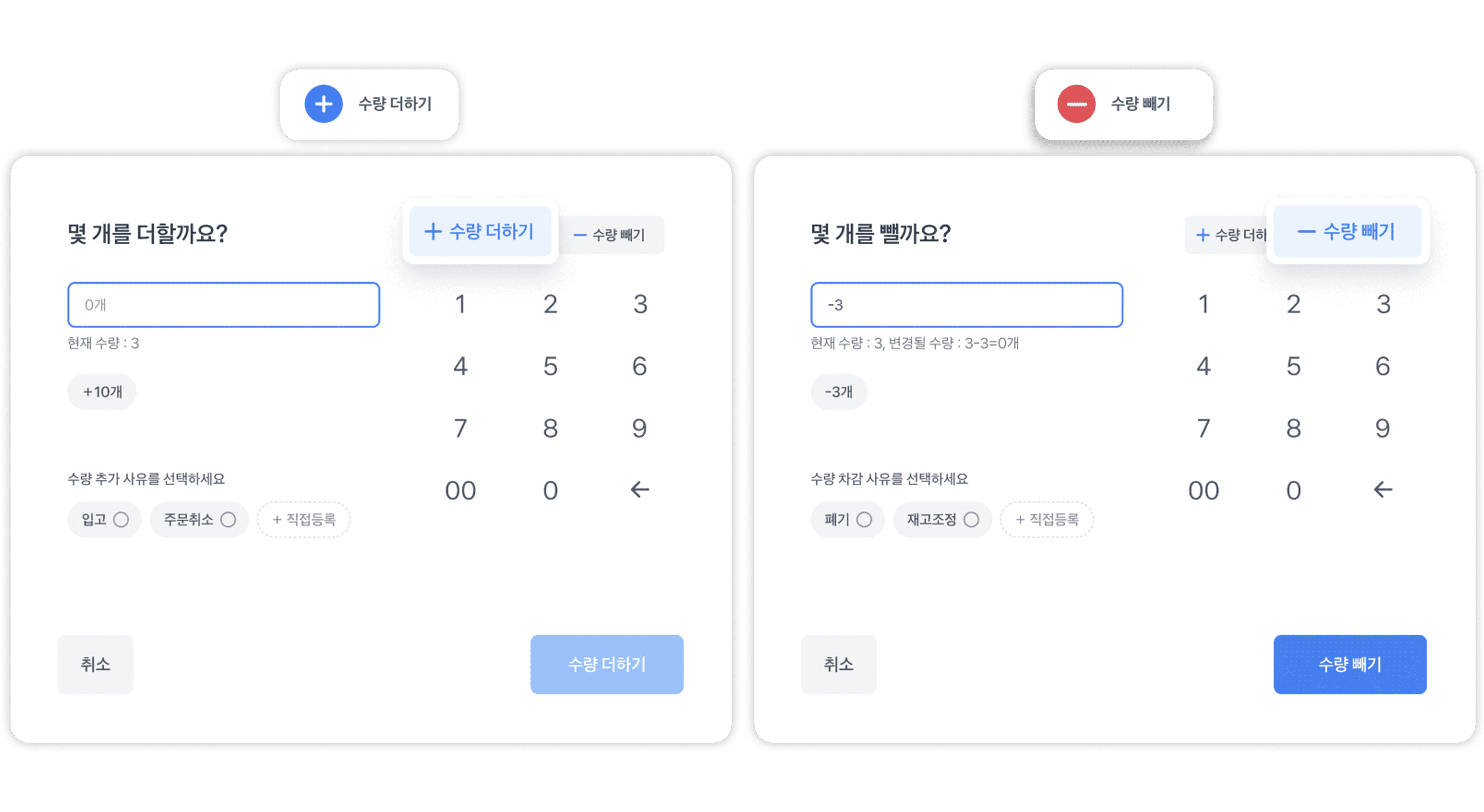 수량은 직접 입력할 수 있고, 버튼으로 조정할 수도 있어요