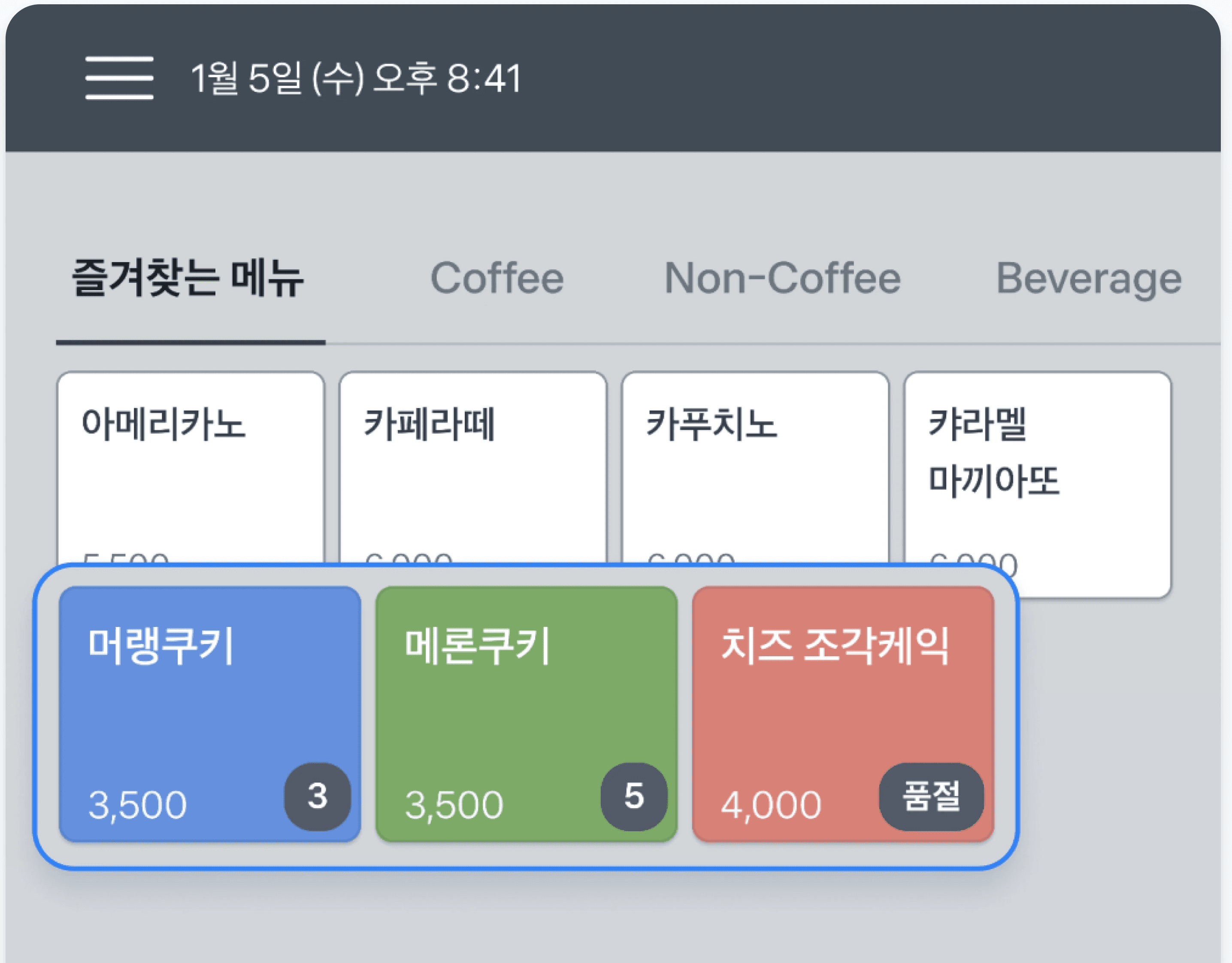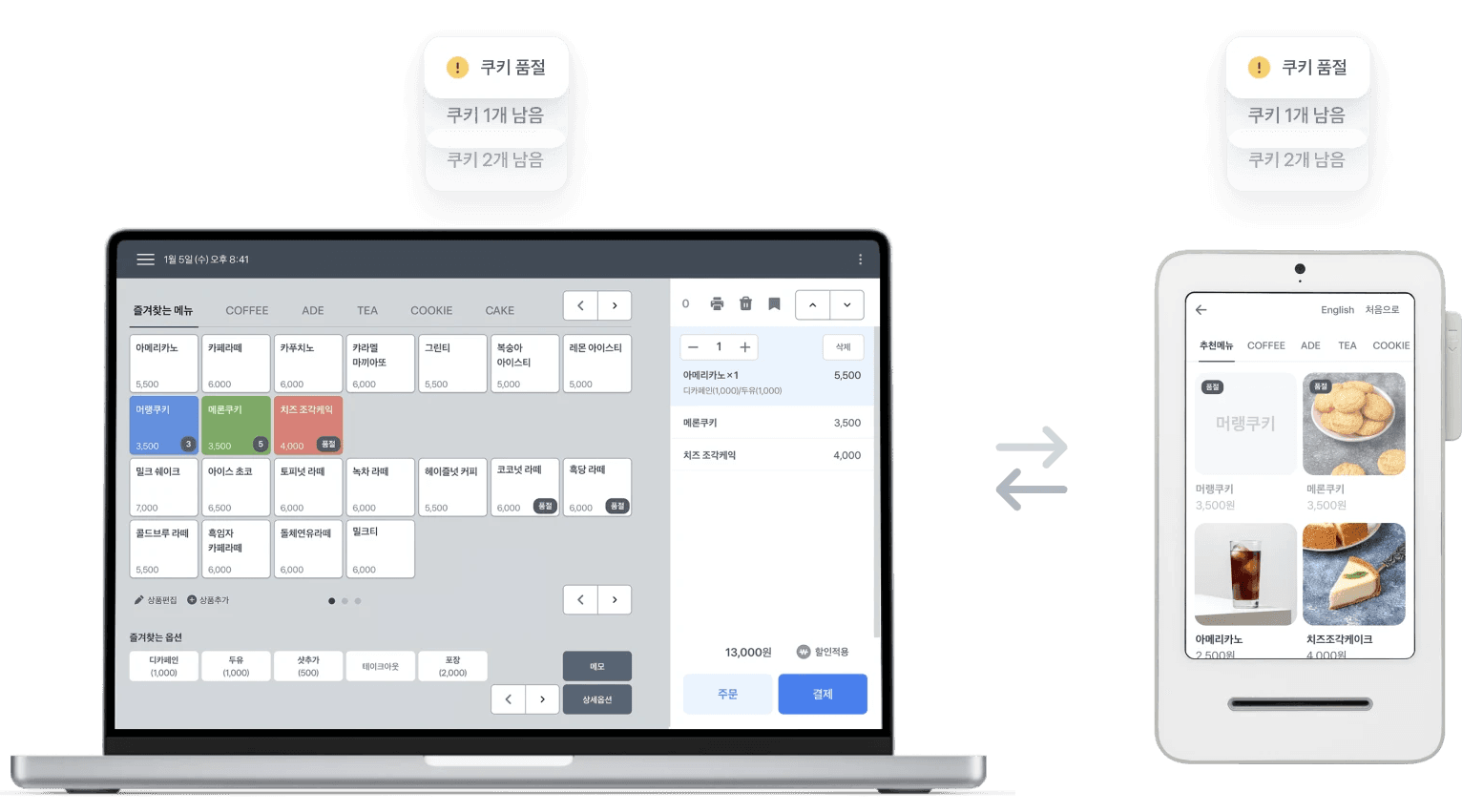 키오스크 모드 연동으로 상품 수량이 0개가 되면 자동으로 '품절' 표시돼요.