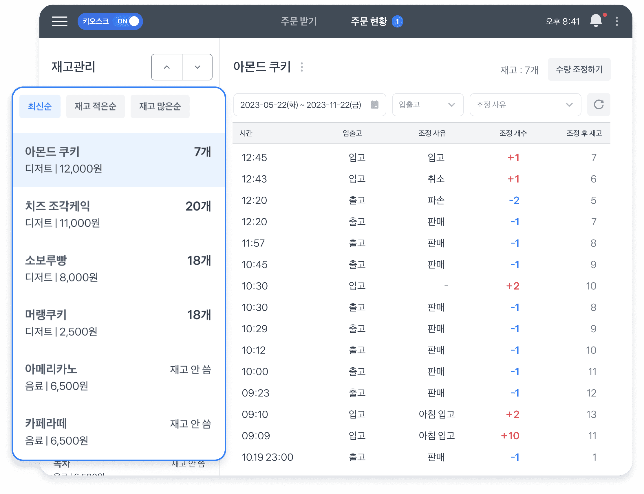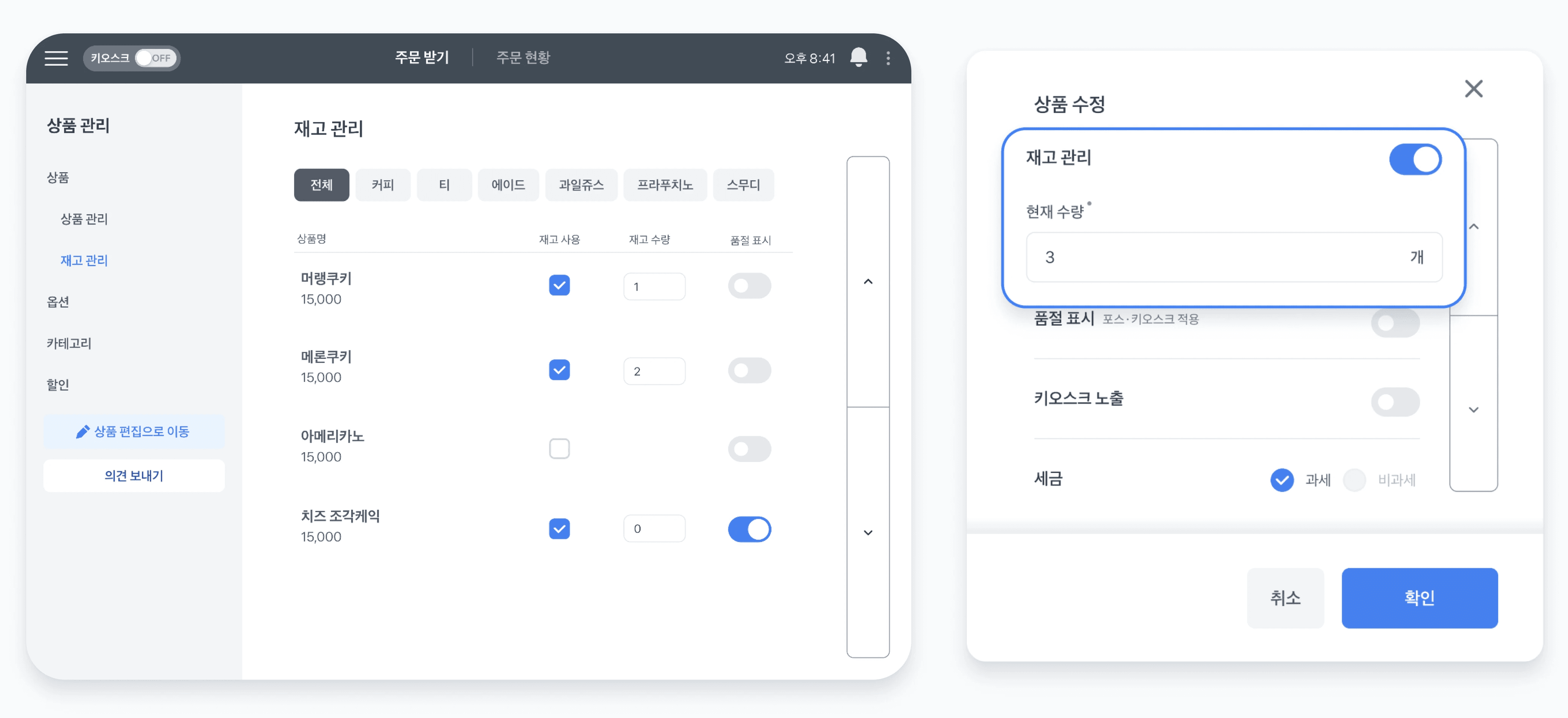 재고 관리 기능으로 사장님은 메뉴 제조나 고객 응대에 집중할 수 있어요.