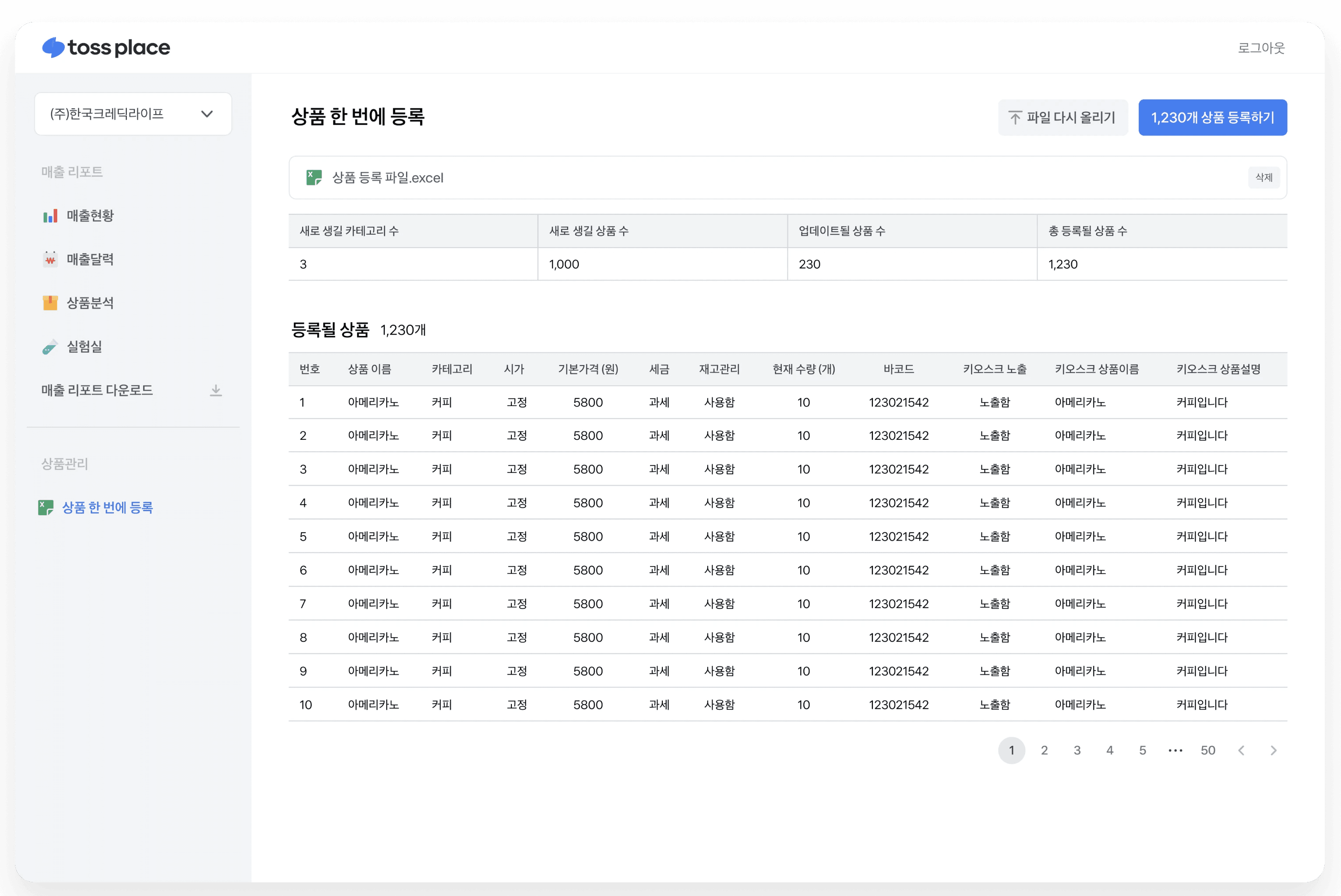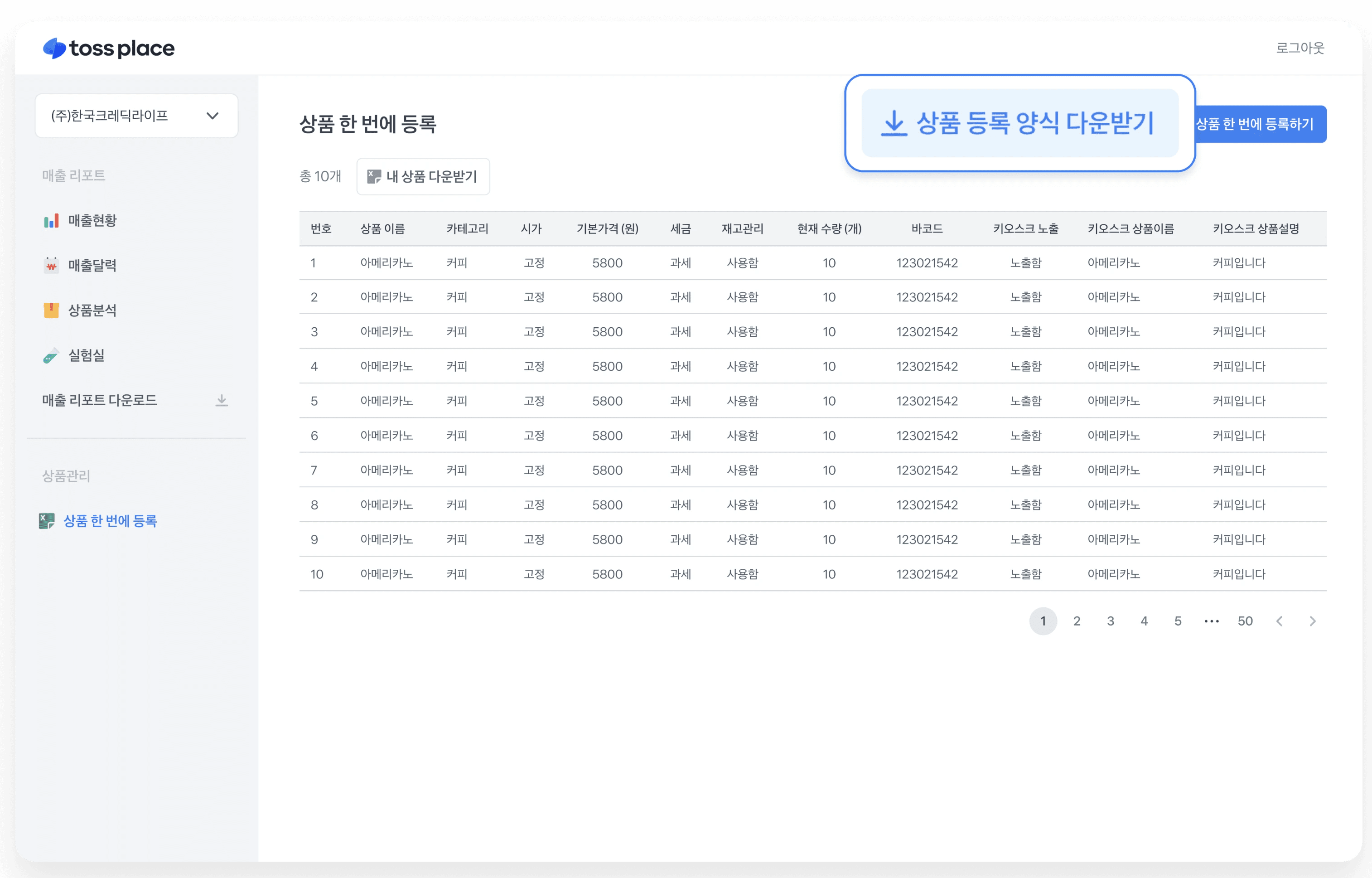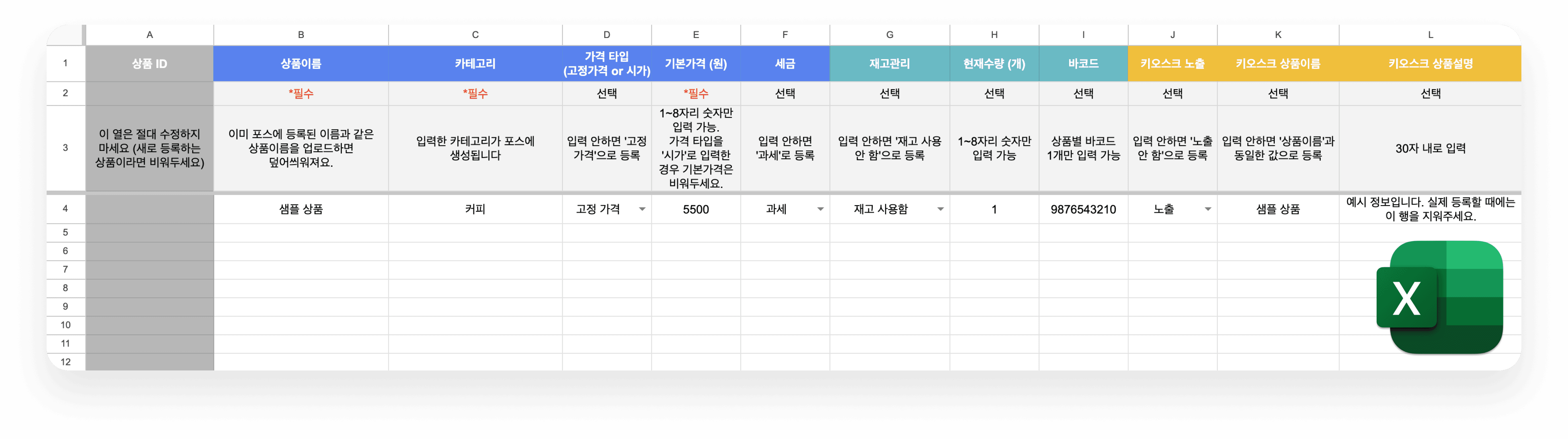상품 한 번에 등록 기능은 대량의 상품을 한 번에 포스에 등록할 수 있는 기능으로 재고관리나 바코드 등록, 키오스크 상품 관리도 한 번에 가능!