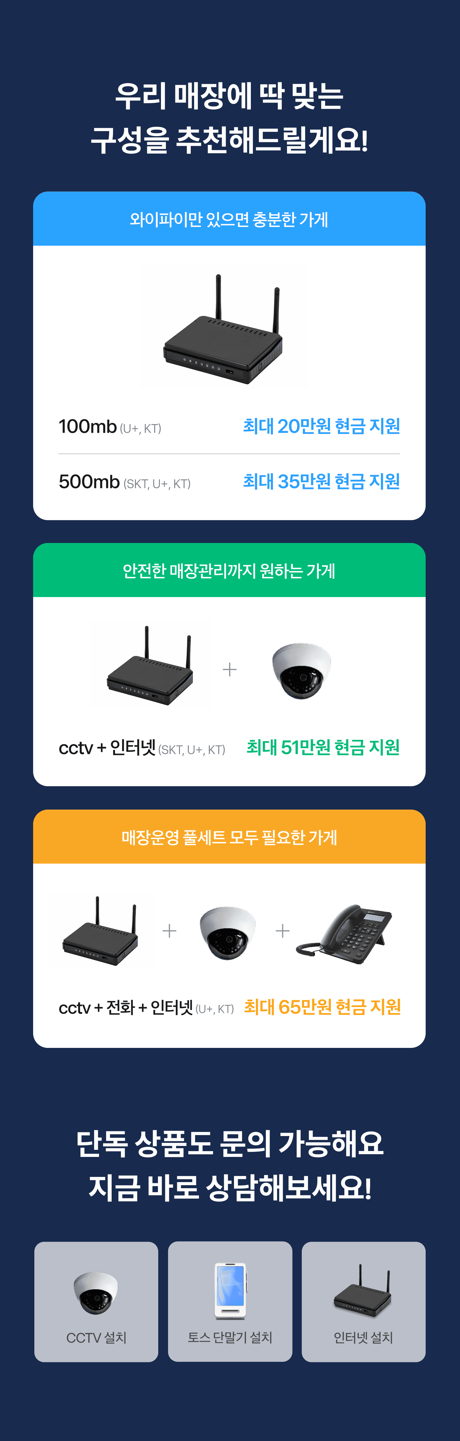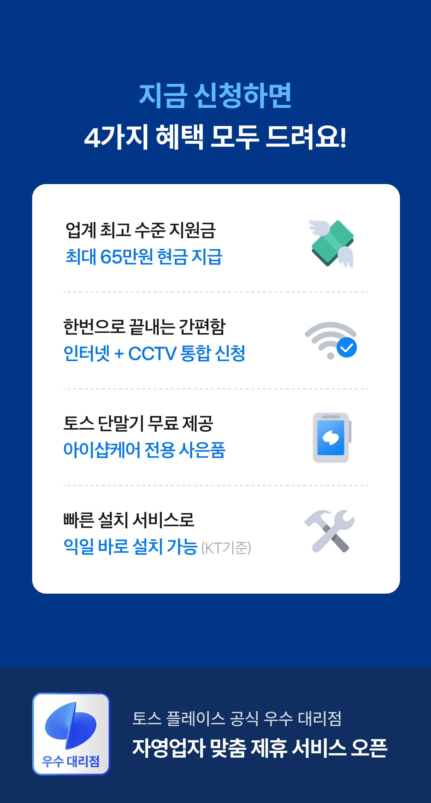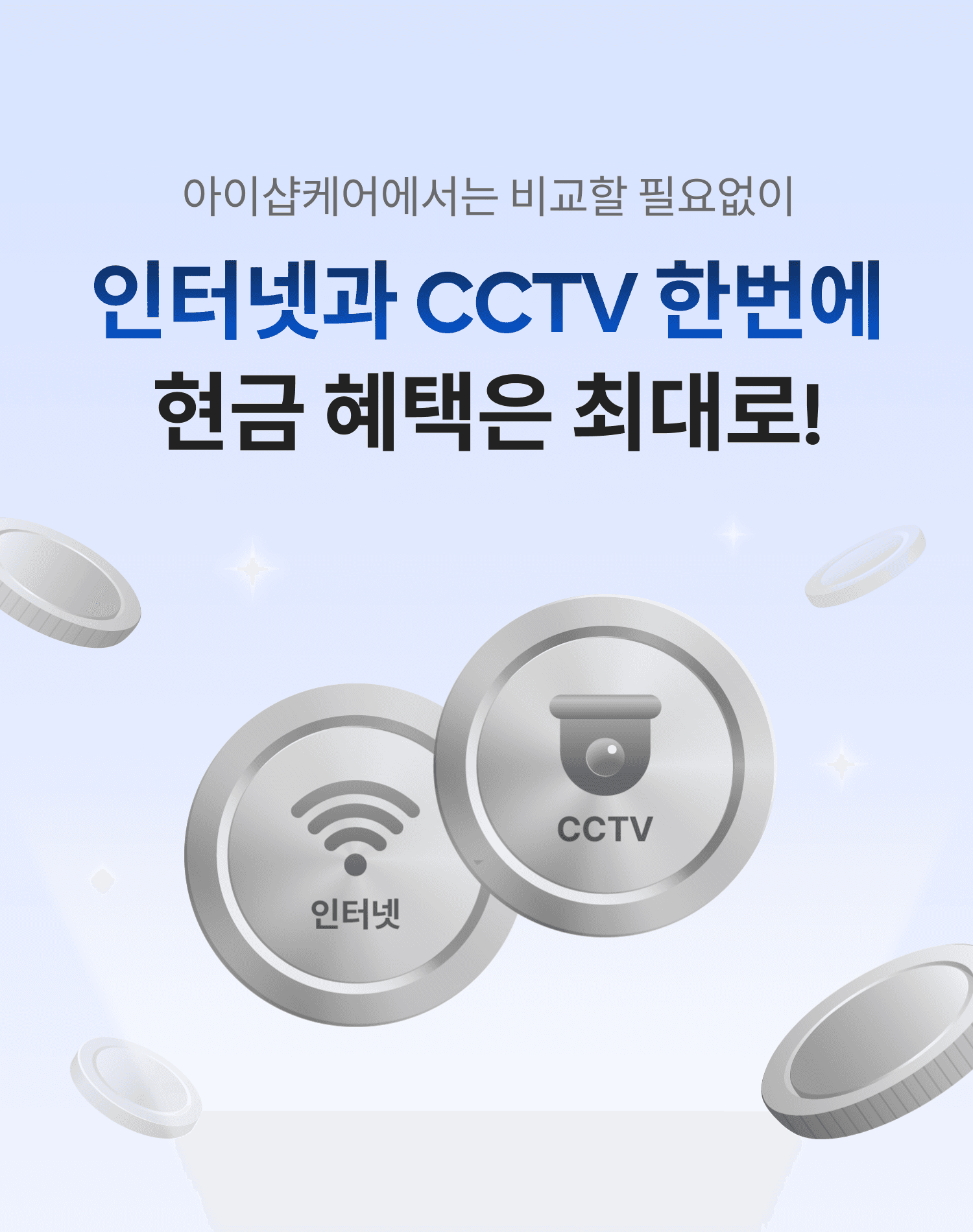 본 프로모션은 아이샵케어 자발적 마케팅 활동의 일환으로 제공되며, 인터넷 + cctv 가입 시 제공되는 혜택은 아이샵케어와의 가맹점계약 체결여부 및 토스단말기 제공과는 무관하게 제공됩니다.